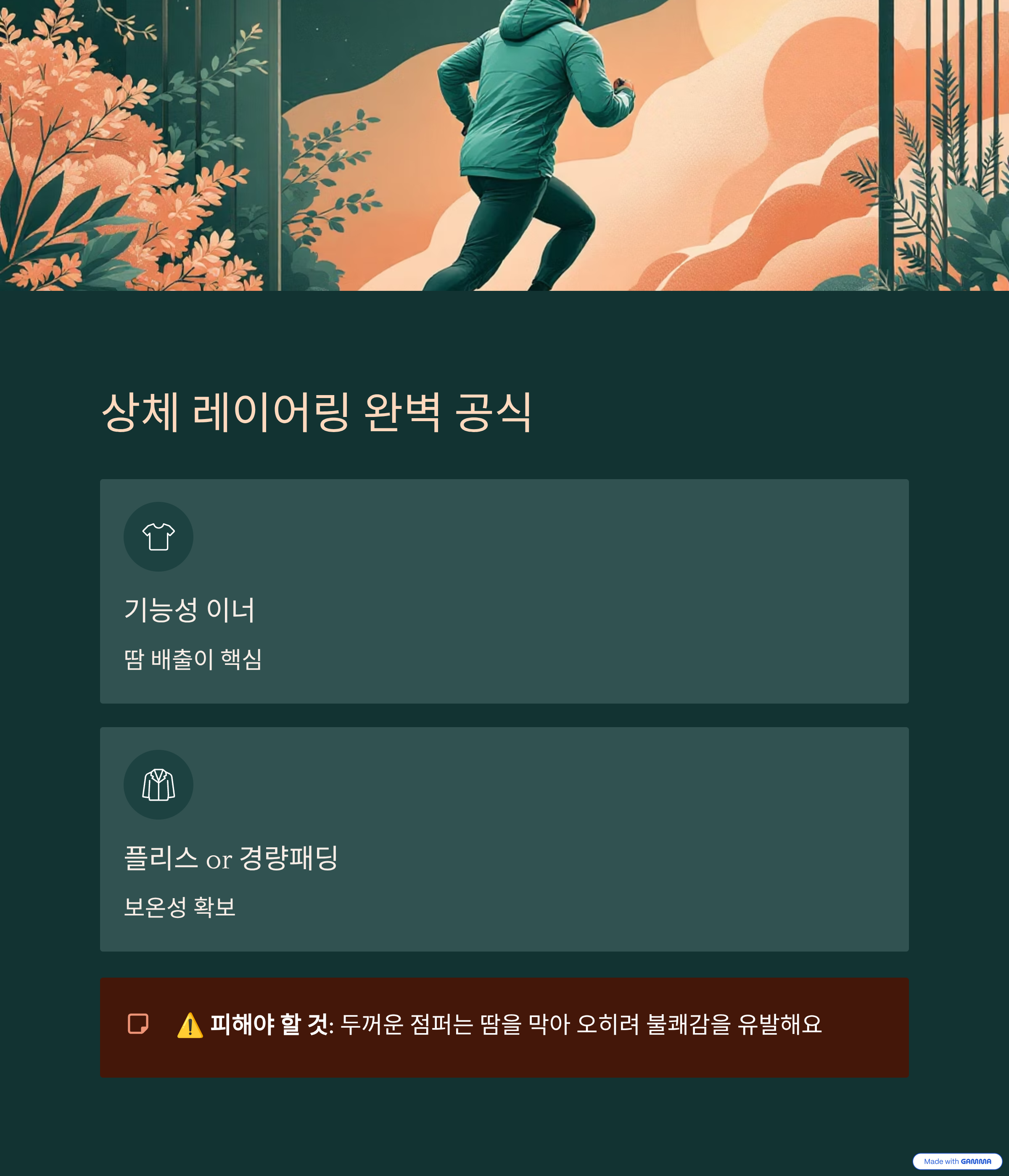 | 상의 | 기능성 이너웨어 + 경량 플리스 또는 패딩 |