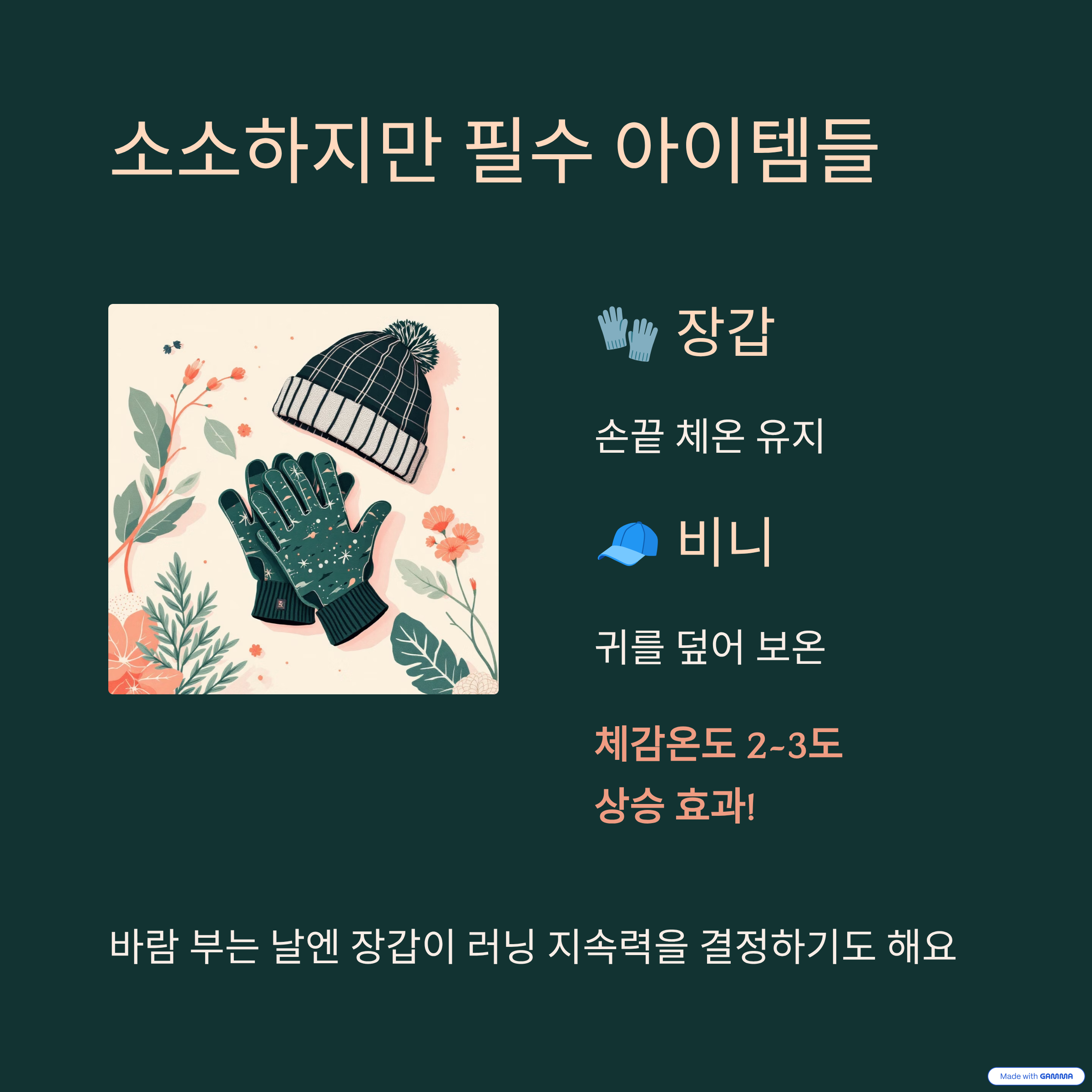 특히 바람 부는 날엔 장갑이 러닝 지속력을 결정하기도 해요.